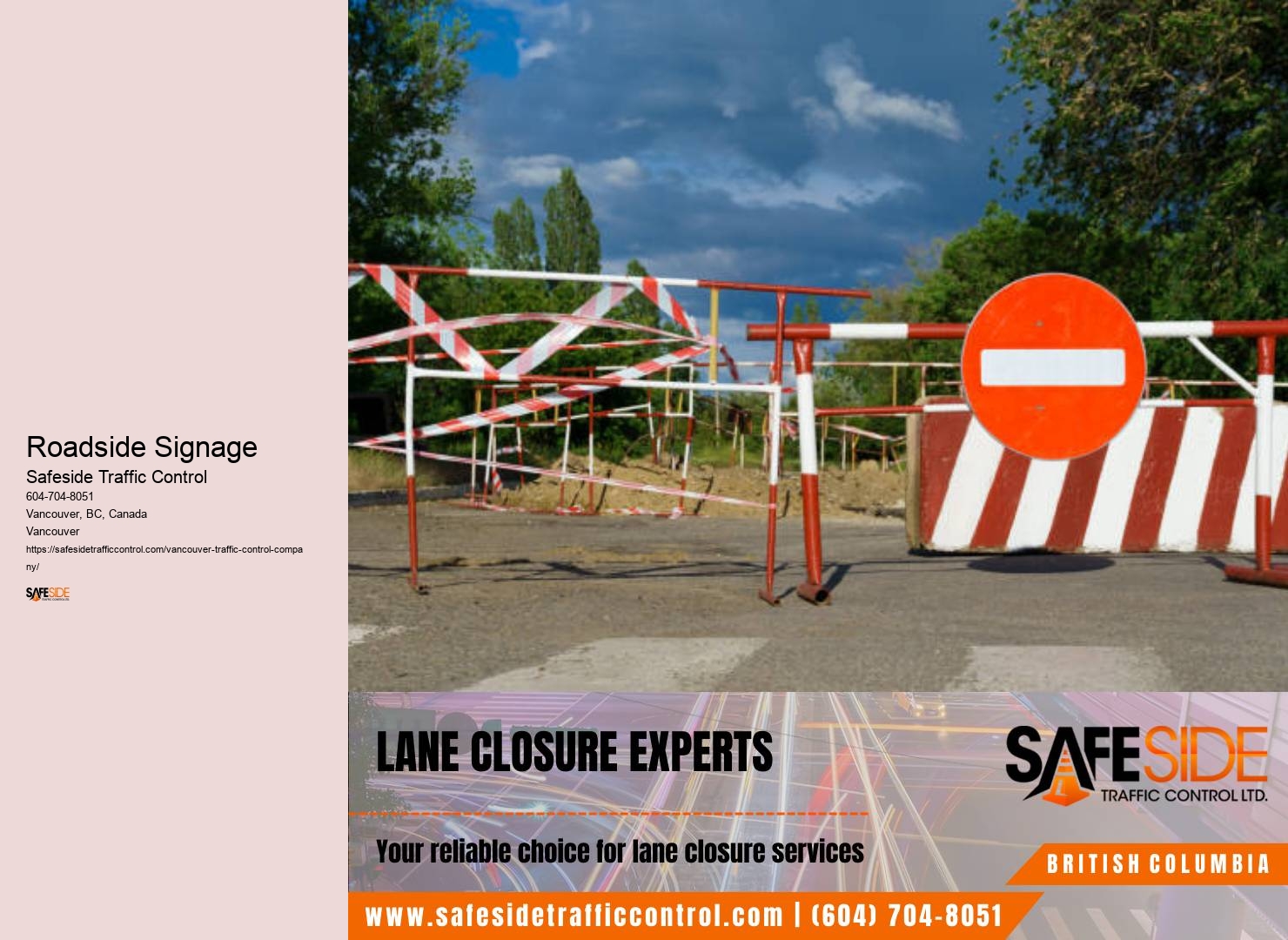 Imagine strolling through busier districts without the usual hustle and dodging. Firstly, they're rolling out state-of-the-art traffic control equipment. Read more about Safeside Traffic Control Ltd here. Friends and colleagues share stories of how they now have extra time in the mornings. Text before the meta title text for each paragraph Roadside Signage Text after the meta title text paragraph With these innovations, Safeside Traffic Control Solutions is transforming your commute into a more efficient, less stressful experience, proving that smart technology can lead to smoother journeys for everyone in Vancouver. You'll find a variety of positions open, from traffic controllers to project managers.
